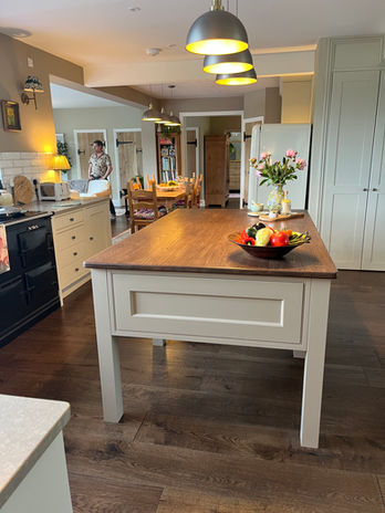 Last year our clients bought this cottage in the Surrey Hills and, typically, it was composed of a number of small rooms downstairs. They had a clear vision of how to enjoy the surrounding beautiful views and their builders transformed the interior by knocking down various walls. The resulting large and interesting space flowed from one area to another, but without clear cut zones. For this reason, our clients wanted an island that resembled a piece of furniture rather than a more substantial kitchen island used for additional storage and seating. We constructed this on site and stained the top to a darker shade of oak with OsmoOil to complement the rich new oak floor. A tea/coffee making area with prep sink positioned by the dining table is another example of the undefined zones. The clients have succeeded in creating a warm, interesting and inviting space which is adorned with artwork, table lamps, soft seating and uses a muted F&B colour scheme.