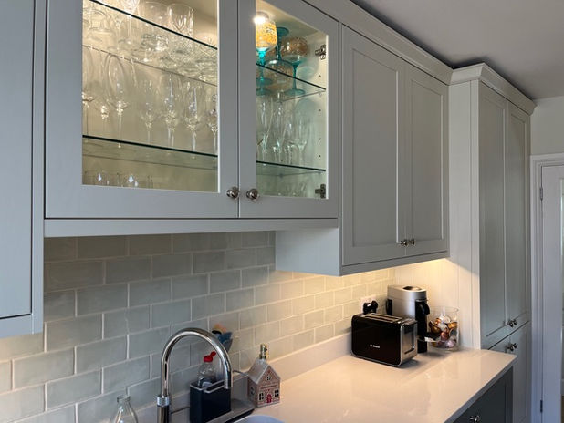 Our client was told by her previous kitchen company that she couldn't have an island. We said she could! By removing the peninsula we freed up the wall and added a narrow vertical window to allow in much needed light. Silver mirror splash-back increased the brightness even more. Viridian cabinets with sparkly white quartz worktops.