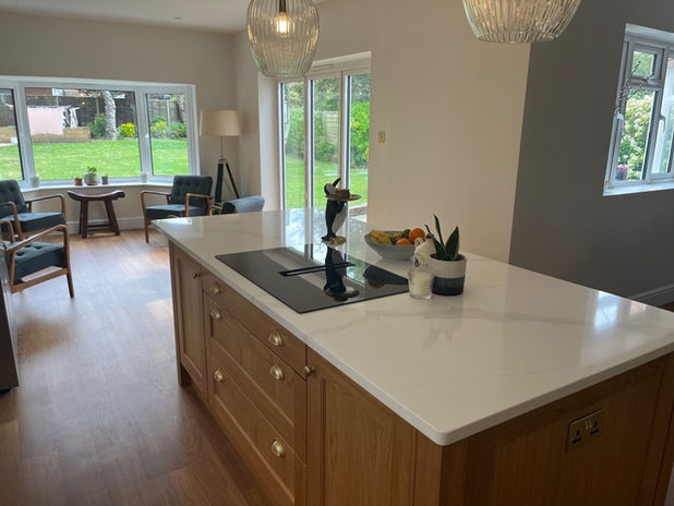 This space was made deeper by extending the kitchen more into the garden, allowing for a much larger dining table orientated the other way and a good sized soft seating area in the space too. The existing Travertine floor tiles were fortunately matched and added to. The client, who is an avid cook and at one time owned a restaurant, also wanted an office station in the space for her current small business. Cobham Blue and Cashmere painted solid ash units with oak effect interiors.