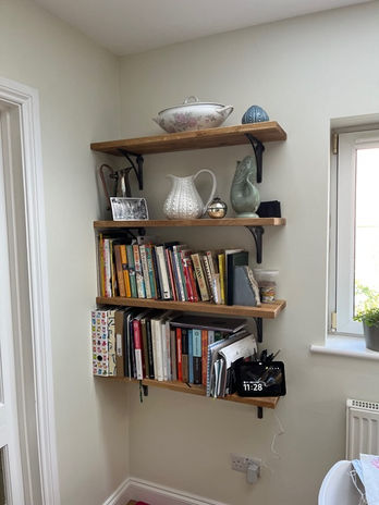 This client has an incredible eye for design, colour and detail. The simple kitchen design stemmed from a treasured black framed display cabinet in the dining area of this new house extension. The reddish hued walls (and utility room units) are a representation of the rich earth colour in South Africa, where our client is from. Many artifacts from her travels and past were now able to be displayed so rather than wall units, the client preferred supported oak chunky shelves, handmade and stained a grey-black colour by Antrona.